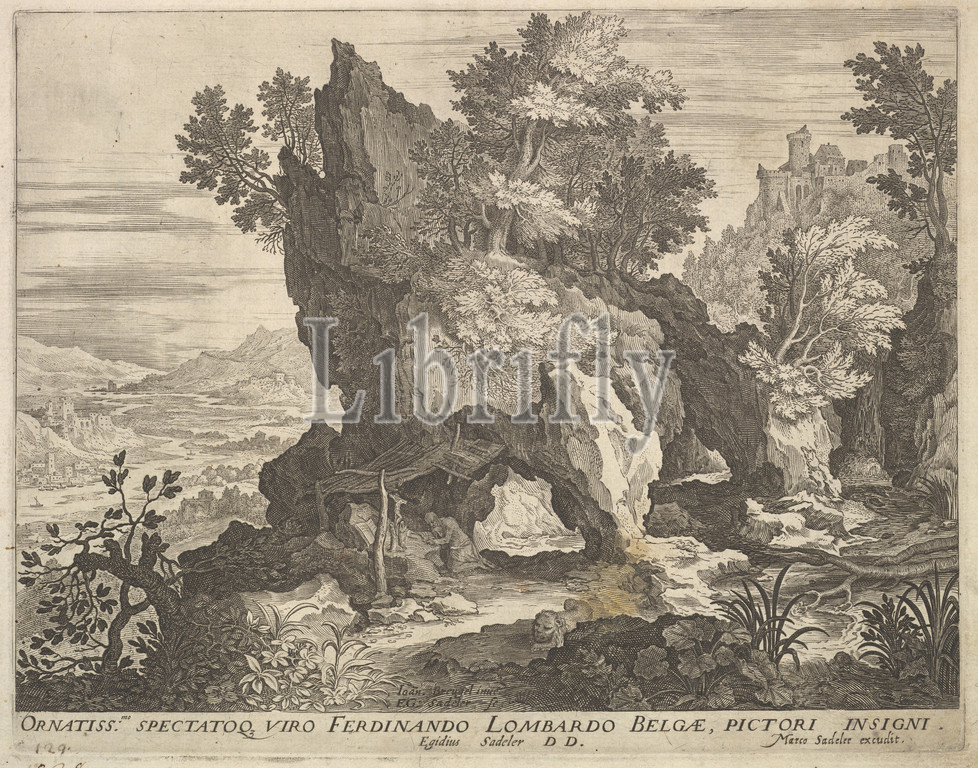 Rocky Landscape, St, Jerome, Engraving, Plate, 8 1/2 x 10 7/8, 21.6 27.7 cm, Prints, Aegidius Sadeler II, Netherlandish, Antwerp, 1568–1629, Prague, After Jan Brueghel the Elder, Brussels, 1568–1625