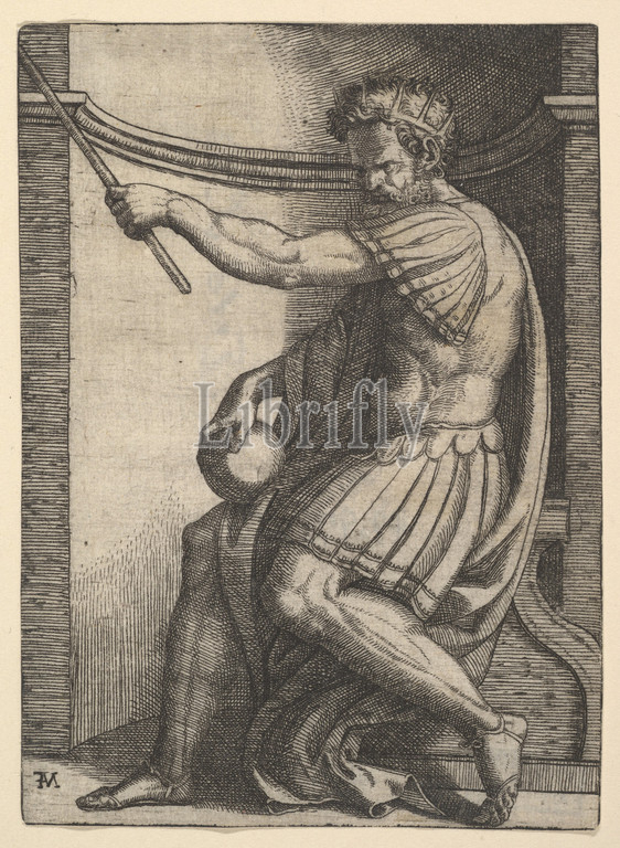 A Roman emperor sitting in a niche holding a sceptre in his raised left hand and a globe in his right hand, ca. 1500–1534, Etching and engraving, Sheet: 4 5/16 × 3 1/8 in. (11 × 8 cm), Prints, Marcantonio Raimondi (Italian, Argini (?) ca. 1480–before 1534 Bologna (?)), After Raphael (Raffaello Sanzio or Santi) (Italian, Urbino 1483–1520 Rome), Or after Giulio Romano (Italian, Rome 1499?–1546 Mantua)
