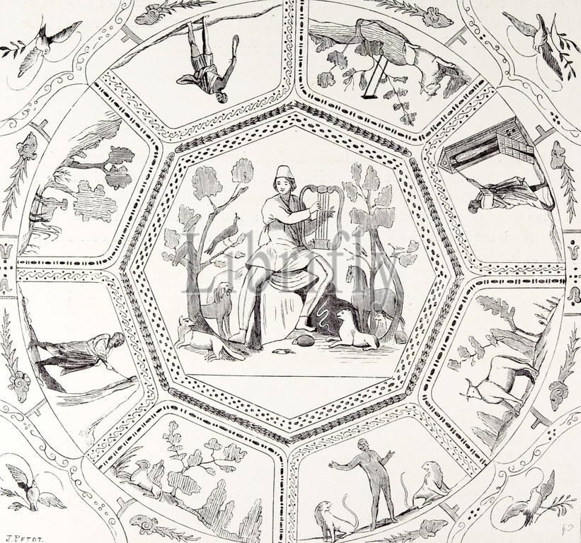 rome italy 1875, paintings, of the first century, on a chapel vault, catacombs, of callistus, house of God, church, churches, fresco, art, liszt collection, vintage, old print, 19th century, victorian, retro, quint, lox, engraving