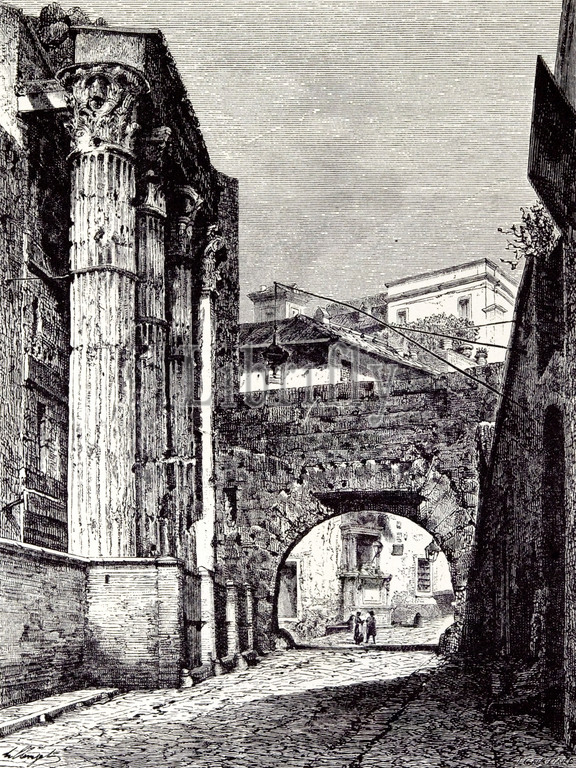 rome italy 1875, temple of nerva, pantani postern, vintage, old print, 19th century, victorian, retro, quint, lox, engraving