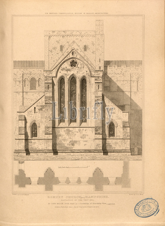 Romsey Church, Hampshire, elevation, west, Elevation, Romsey Abbey Church, Romsey, Hampshire, signed, Drawn, G. Cattermole, Etch'd, John Le Keux, Published, Longman &, Co, Fig. 39, p. 260, Cattermole, George, drawing, Keux, John Le, etching, Longman & Co., published, 1819, John Britton, architectural antiquities, Great Britain, represented, illustrated, series, views, elevations, plans, sections, details, various ancient English edifices, historical, descriptive accounts, Bd, 5, London, J, Taylor, 1807-1826