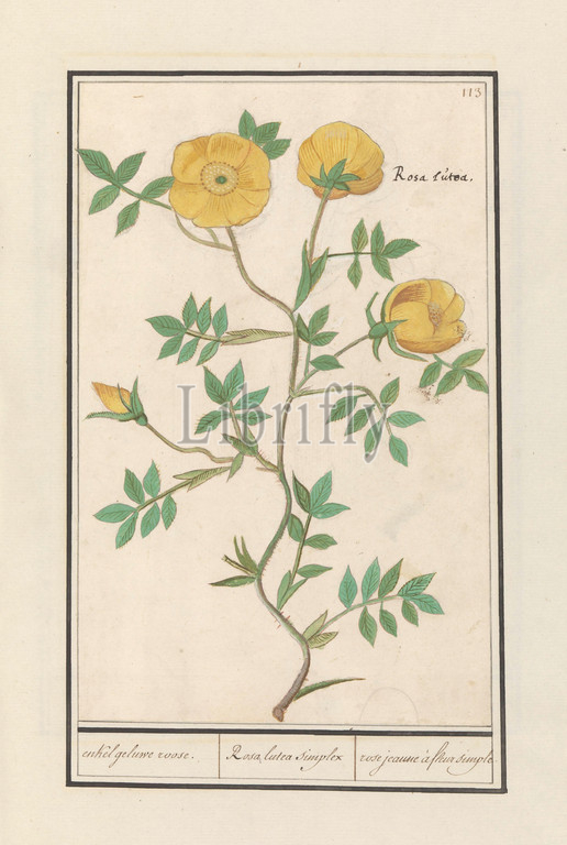 Rose, Rosa, single gel rose, Rosa lutea simplex, rose jeaune à fleur simple, title, object, Yellow rose, Numbered top right, 113, Latin name, Part, second album, drawings, flowers, plants, Ninth, twelve albums, animals, birds, 1600, commissioned, Emperor Rudolf II, explanations, Dutch, Latin, French, Anselmus Boetius de Boodt, 1596, 1610, paper, watercolor, paint, deck paint, pencil, ink, pen