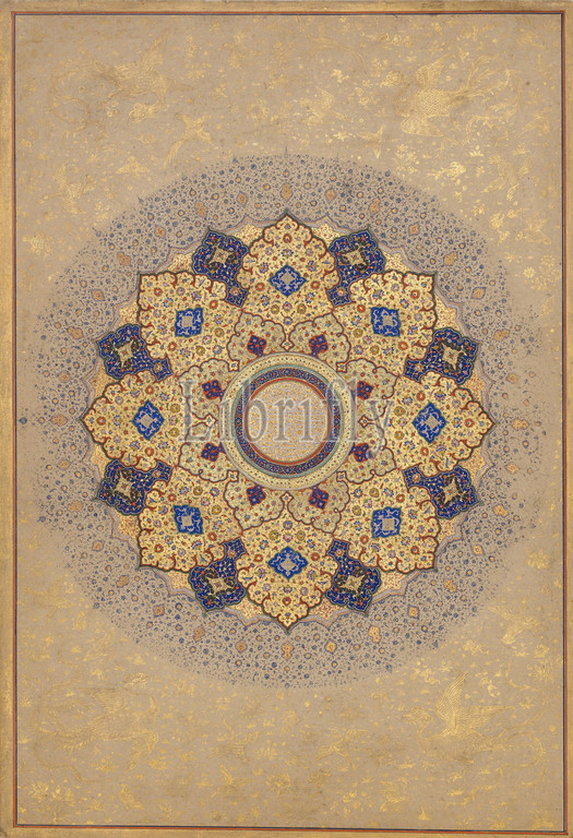 Rosette Bearing, Names, Titles, Shah Jahan, Folio, Jahan Album, recto, ca, 1645, verso, 1630–40, India, Ink, opaque watercolor, gold, paper, H, 15 3/16, 38.6 cm, Codices, shamsa, literally, sun, traditionally opened, imperial, Mughal, albums, Worked, bright colors, several tones, meticulously designed, painted arabesques, enriched, fantastic flowers, birds, animals