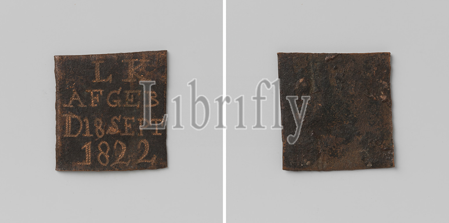 The Round Lutheran Church burned down, September 18, 1822, Square copper medal. Front: inscription. Reverse: blank, Amsterdam, AFGEB, D18SEPT, anonymous, Netherlands, 18-Sep-1822, copper (metal), engraving, h 2.6 cm × w 2.4 cm
