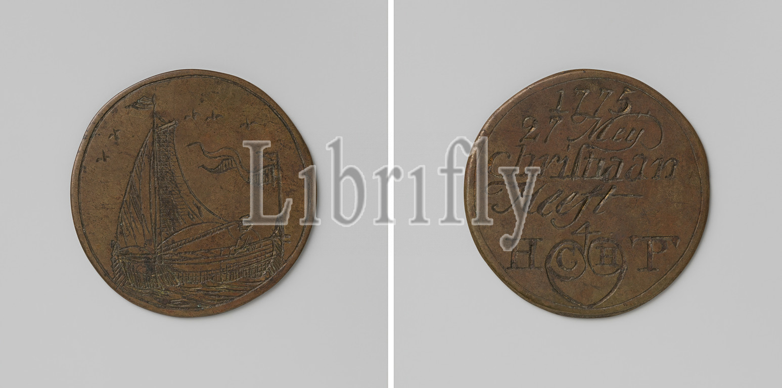 Rowing, scaffolding, boatmen's guild, Amsterdam, guild token, Christiaan, berth, Haringpakkerstoren scaffolding, Brass medal, Front, sailboat sailing, left, rear, sitting man, flag, Reverse, inscription, house brand, heart, letters C, H, monograms, letters H, P, T, 1775, brass, alloy, engraving