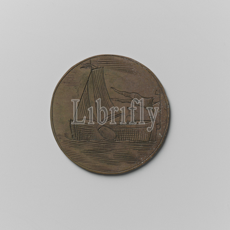 Rowing, scaffolding and boatmen's guild of Amsterdam, guild token of Jacob Steffens, berth of Nieuwe Brug, brass medal. Front: sailboat sailing to the left, on rear: sitting man and flag. Reverse: inscription above house brand and heart with letters J and S between monograms of letters N and B, Amsterdam, Jacob Steffens, anonymous, 1793, brass (alloy), engraving, d 3.2 cm × w 5.96 gr