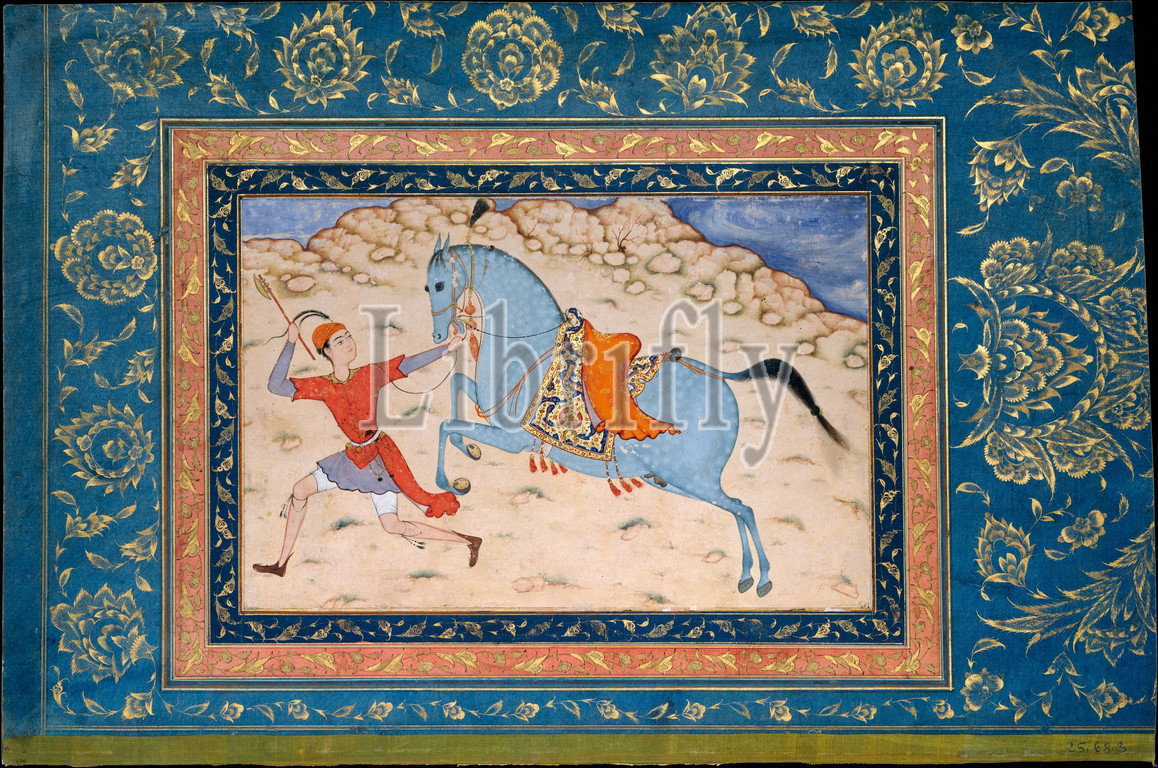 Royal Horse and Runner, 16th–17th century, Attributed to India, Ink, opaque watercolor, and gold on paper, Page: H. 11 3/4 in. (29.8 cm), Codices, The drawing of the blue-gray horse, its rich saddle, and the bare, rocky landscape are in a Persian vein, while the groom, with his small, tight turban, is rendered in the contemporary Mughal style.