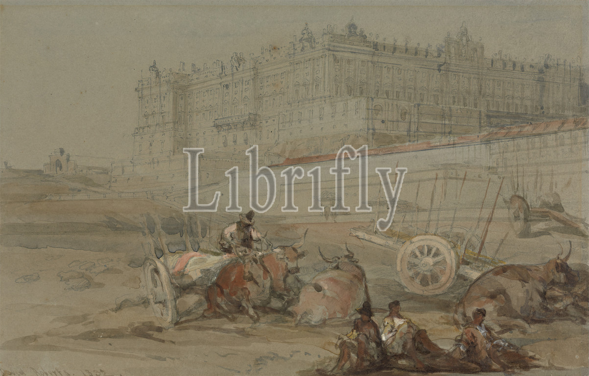 Royal Palace, Madrid, 1832, David Roberts, 1796–1864, British, 1832, Graphite, watercolor, gouache, thick, slightly textured, cream wove paper, Sheet, architectural subject, bulls, carriages, genre subject, men, palace, España, Europe, Madrid