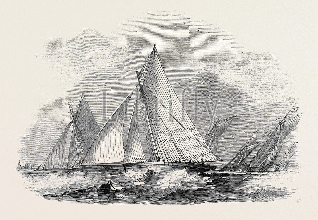 royal, thames, medium-sized sailboat, yacht, club, match, belvidere, mug, cup, drawn, n.m., condy, esq, blue, belle, i, champion, mystery, antagonist, 1845 engraving, engraved image, history, illustrative technique, engravement, victorian, arts, culture, retro styled, vintage, retro, arkheia