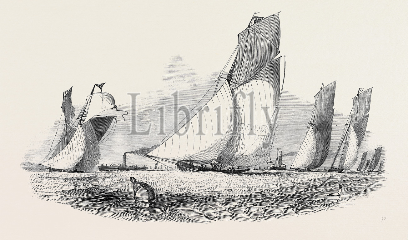 royal, thames, medium-sized sailboat, yacht, club, match, drawn, n.m., condy, esq, mystery, antagonist, belvidere, vixen, prima, donna, sail, 1845 engraving, engraved image, history, illustrative technique, engravement, victorian, arts, culture, retro styled, vintage, retro, arkheia