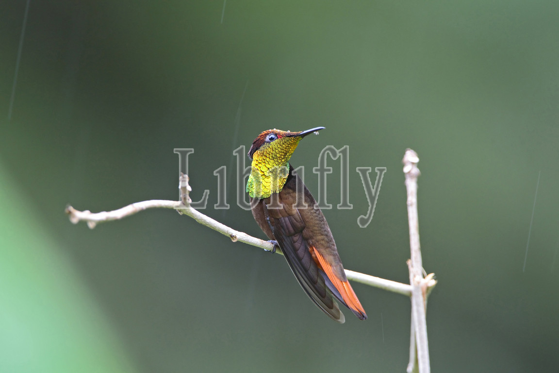 Ruby topaz Hummingbird perched on branch during rainshower Tobago