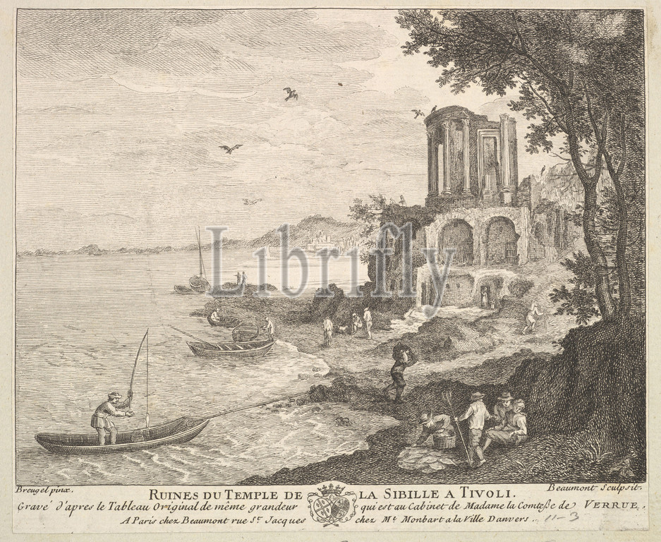 Ruins, Temple, Sybil, Tivoli, Ruines du Temple de la Sibille, painting, collection, Madame Comtesse Verrue, Etching, engraving, Sheet, 5 15/16 x 7 3/16, 15.1 18.2 cm, Prints, Pierre François Beaumont, French, 1719, –after, 1777, After Jan Brueghel the Elder, Netherlandish, Brussels, 1568–1625, Antwerp