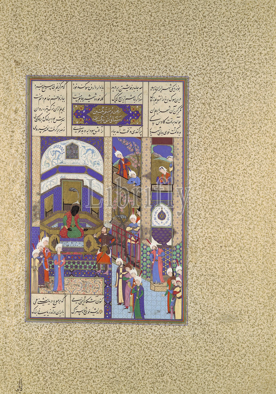 'Rustam Blames Kai Kavus for the Death of Siyavush', Folio 202v from the Shahnama (Book of Kings) of Shah Tahmasp, ca. 1525–30, Made in Iran, Tabriz, Opaque watercolor, ink, silver, and gold on paper, Painting: H. 11 1/8 in. (28.3 cm), Codices, Painting attributed to Qadimi (active ca. 1525–65), The news of the death of Siyavush causes lamentation at the Iranian court and in Zabulistan, where Rustam swears to avenge his murder. After a period of mourning, Rustam journeys with his army to the court of Kai Kavus