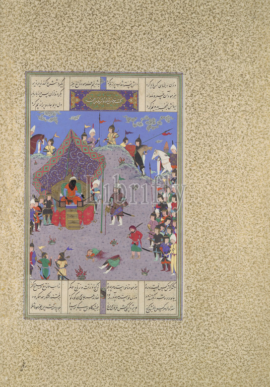 'Rustam Brings the Div King to Kai Kavus for Execution', Folio 127v from the Shahnama (Book of Kings) of Shah Tahmasp, ca. 1525–30, Made in Iran, Tabriz, Opaque watercolor, ink, silver, and gold on paper, Painting: H. 11 3/16 x W. 7 1/8 in. (H. 28.4 x W. 18.1 cm), Codices, Painting attributed to Mir Musavvir (active 1525–60), Painting attributed to Qasim ibn 'Ali (active ca. 1525–60), Even with the death of the White Div and the Div General Arzhang, the demons of the Div King of Mazandaran continue to harry the Iranians. At last, Kai Kavus leads his army into battle gainst the divs