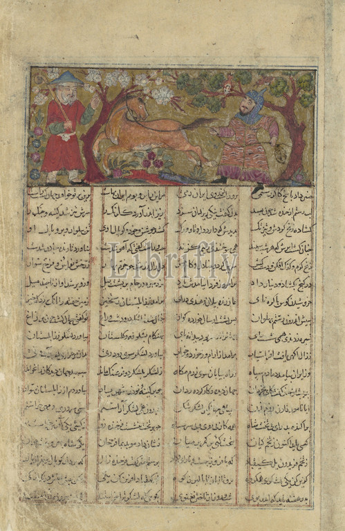 'Rustam Lassos Rakhsh', Folio from a Shahnama (Book of Kings) of Firdausi, ca. 1330–40, Attributed to Iran, probably Isfahan, Ink, opaque watercolor, gold, and silver on paper, Painting: H. 1 11/16 in. (4.3 cm), Codices, Rustam and his steed to be, the strawberry roan Rakhsh, are in the center of the miniature, framed by a tree on either side. Rustam is shown in his traditional tiger skin coat, but here is depicted with the beard and mustache reserved for mature men though he is still a young man