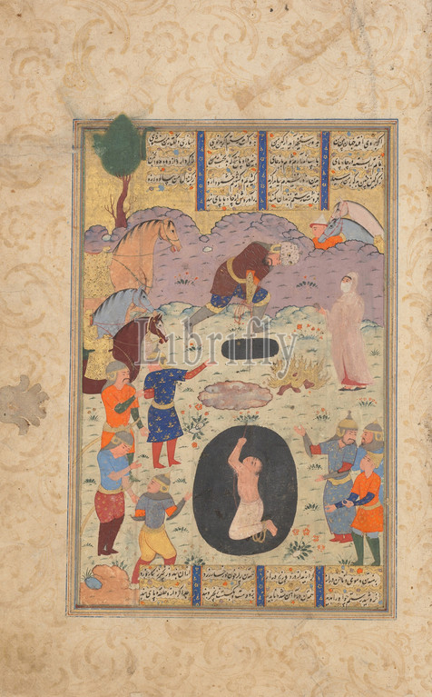 Rustam rescues Bizhan, Pit, Folio, Shahnama, Book, Kings, 1560–80, Attributed, Iran, Opaque watercolor, silver, gold, paper, Page, 14 5/8 x 8 7/8, 37.1 22.5 cm, Codices