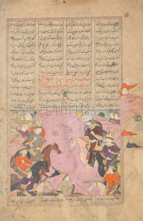 Rustam, First Encounter, Afrasiyab, Folio, Shahnama, Book, Kings, dated .H, 1077/ .D, 1666–67, Attributed, Iran, Isfahan, Ink, opaque watercolor, silver, gold, paper, Codices, Attributed to Mu'in Musavvir, active ca., 1630–97
