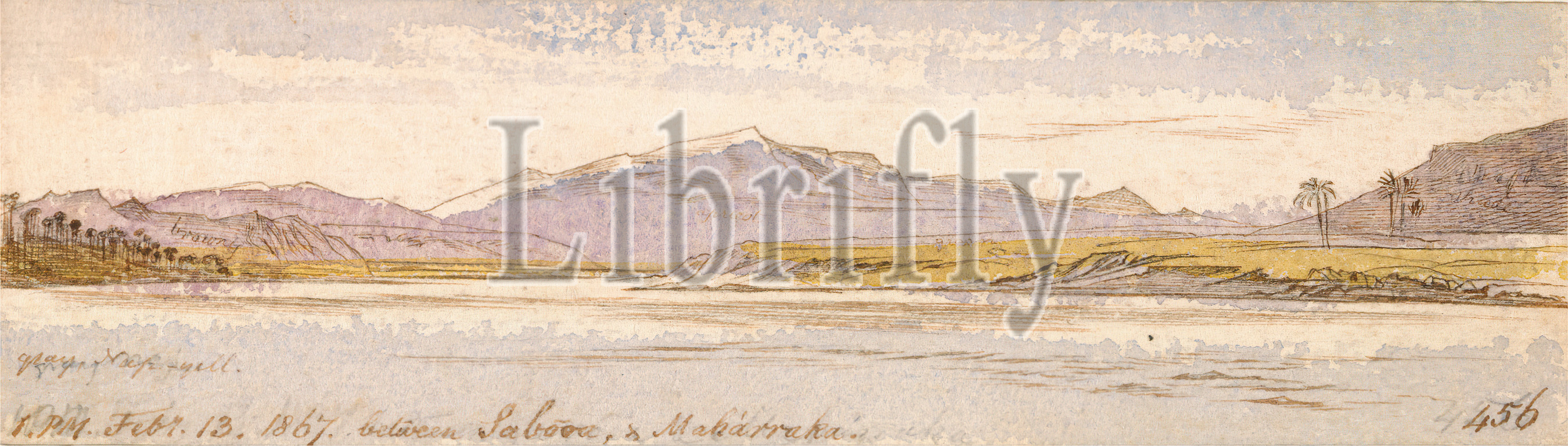 Sabooa & Maharraka, Edward Lear, 1812–1888, British, 1867, Watercolor, graphite, pen, brown ink, moderately thick, rough, wove paper, mounted, thick, slightly textured, cream wove paper, Sheet, lake, landscape, mountains, palm trees, river, river, sky, water, Africa, Egypt, Lake Nasser, Nile, Nubia