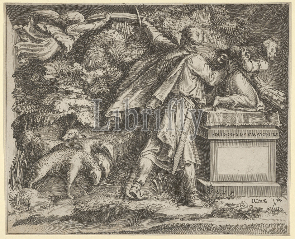 The Sacrifice of Isaac set in a landscape with a flock of sheep at left and an angel guiding Abraham's sword at upper left, 1570–1615, Engraving, Sheet: 7 1/8 × 8 3/4 in. (18.1 × 22.3 cm), Prints, Cherubino Alberti (Zaccaria Mattia) (Italian, Borgo Sansepolcro 1553–1615 Rome), After Polidoro da Caravaggio (Italian, Caravaggio ca. 1499–ca. 1543 Messina)