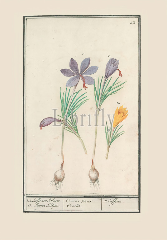 Saffron crocus, Crocus sativus, yellow crocus, Crocus, 1 2, Saffron Flower, 3, Somer Sottjen, Crocus verus Crocus, Saffran, title, object, Numbered top right, 12, Part, first album, drawings, flowers, plants, Eighth, twelve albums, animals, birds, 1600, commissioned, Emperor Rudolf II, explanation, Dutch, Latin, French, crocus, Anselmus Boetius de Boodt, 1596, 1610, paper, watercolor, paint, deck paint, chalk, ink, pen