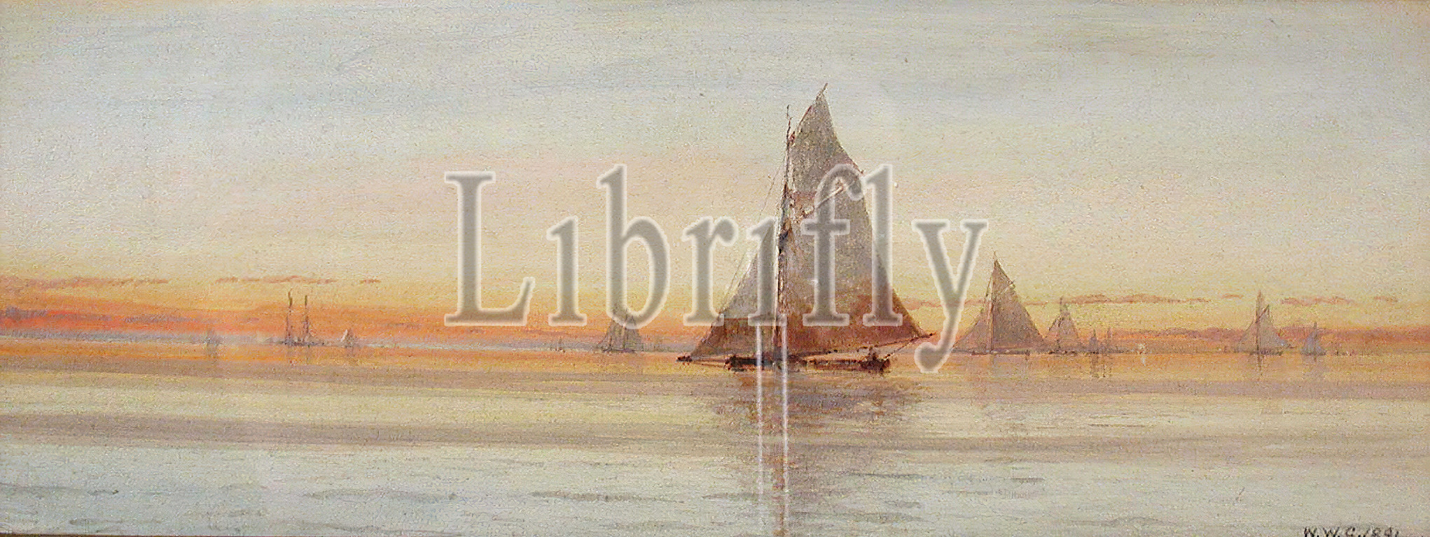 Sailboats, Sunset, William W. Churchill, American, 1858-1926, 1881, watercolor, off-white paper, 8 x 21-3/8, 20.3 x 54.3 cm., sight, initialed, dated, L.R., W.W.C. 1881