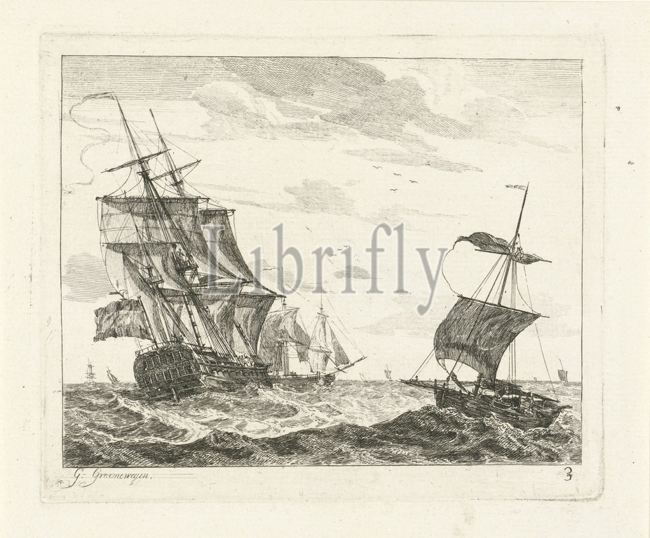 Sailing ships, troubled sea Seascapes, ships, series title, foreground three large sailing ships, background several smaller boats, print, part, series, six prints, different sailing ships, sea, margin, right, 3, general, Gerrit Groenewegen, mentioned, object, Rotterdam, 1786, paper, engraving