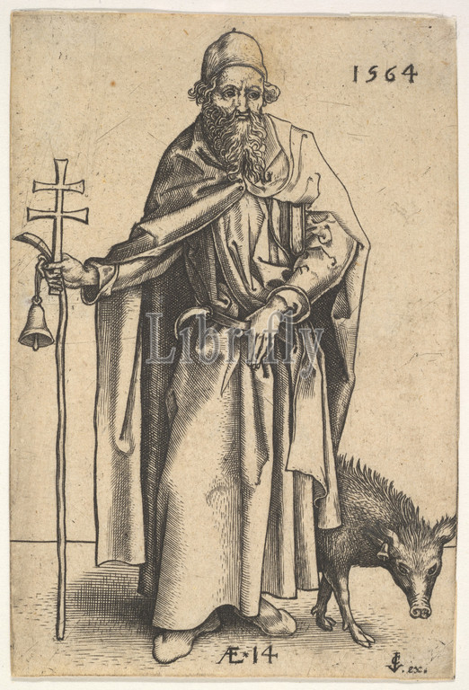Saint Anthony, 1564, Engraving, sheet, 3 1/2 x 2 3/8, 8.9 6 cm, Prints, Hieronymus, Jerome, Wierix, Netherlandish, ca., 1553–1619, Antwerp, Jan, Johannes, 1549–1615, Brussels, After Martin Schongauer, German, Colmar ca., 1435/50–1491, Breisach