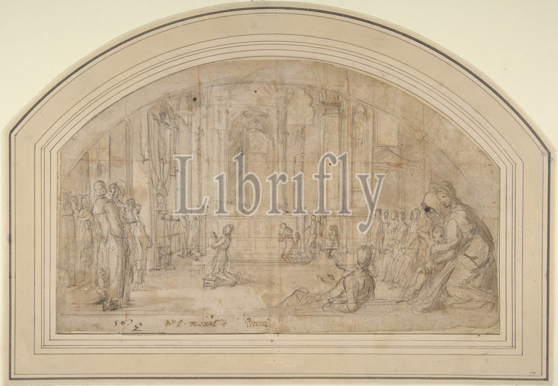 Saint Antoninus Kneeling, Crucifix, Orsanmichele, Florence, 1600–1605, Charcoal, pale brown wash, beige paper, Partially squared off, red chalk, 6-7/8 x 10-15/16, 17.4 27.8 cm, Drawings, Bernardino Poccetti, Italian, San Marino di Valdelsa, 1548–1612, Walter Vitzthum, 1955 identified, drawing, study, lunette-shaped frescoes, representing, scenes, life, Dominican archbishop, Antoninus, painted, Poccetti ca