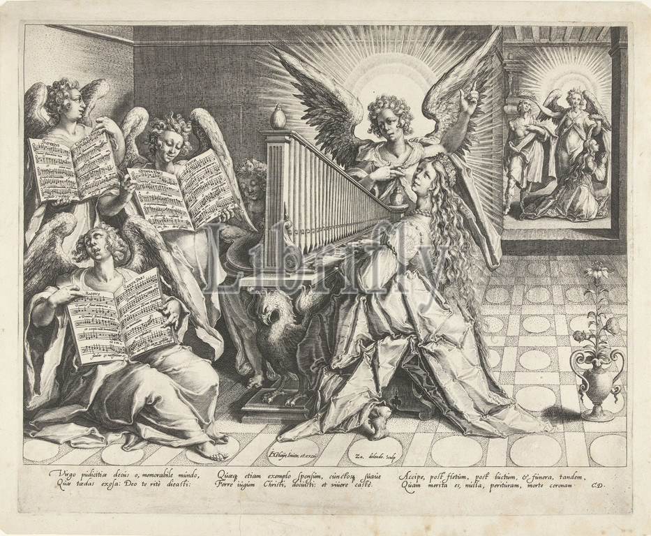 Saint Cecilia, organ, organ surrounded, singing angels, Three angels, sheet music, composer Cornelis Schuyt, background, look, another room, angel crowns Cecilia, another female saint, Latin verse, Cornelis Duyn, St. Cecilia, patroness, music, angels singing, printed edition, musical score, vocal music, singing, Zacharias Dolendo, mentioned, object, Leiden, c, 1593, paper, engraving