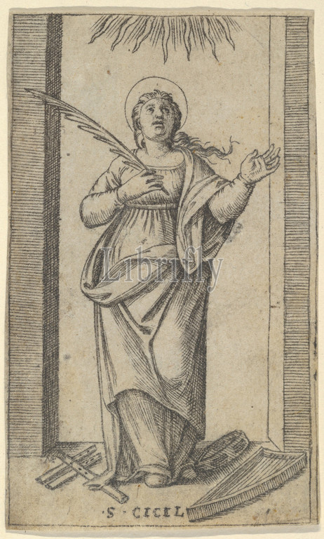 Saint Cecilia standing holding, palm, martyrdom, right hand, series, Piccoli Santi, Small Saints, ca, 1500–1527, Engraving, 3 1/4 x 1 15/16, 8.3 4.9 cm, Prints, Marcantonio Raimondi, Italian, Argini, ca., 1480–before, 1534, Bologna