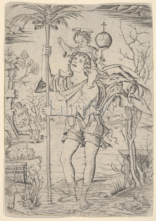 Saint Christopher with the Christ Child on his shoulder, ca. 1500–1510, Engraving, sheet: 5 7/8 x 4 1/8 in. (15 x 10.5 cm), Prints, Nicoletto da Modena (Italian, Modena, active ca. 1500–ca. 1520)