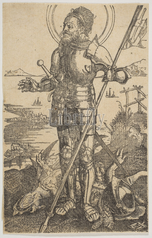 Saint George Standing, copy, n.d, Engraving, Sheet, 4 7/16, 2 13/16, 11.3, 7.2 cm, Prints, After Albrecht Dürer, German, Nuremberg, 1471–1528
