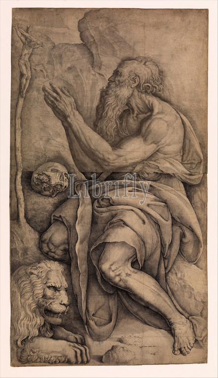 Saint Jerome kneeling, crucifix, skull, lion, ca, 1550–60, Etching, engraving, Sheet, Trimmed, 34 5/8, 19 1/16, 88, 48.4 cm, Prints, Battista Franco, Italian, Venice ca., 1510–1561, Venice, Counterproofs, three impressions, print, lower half, verso