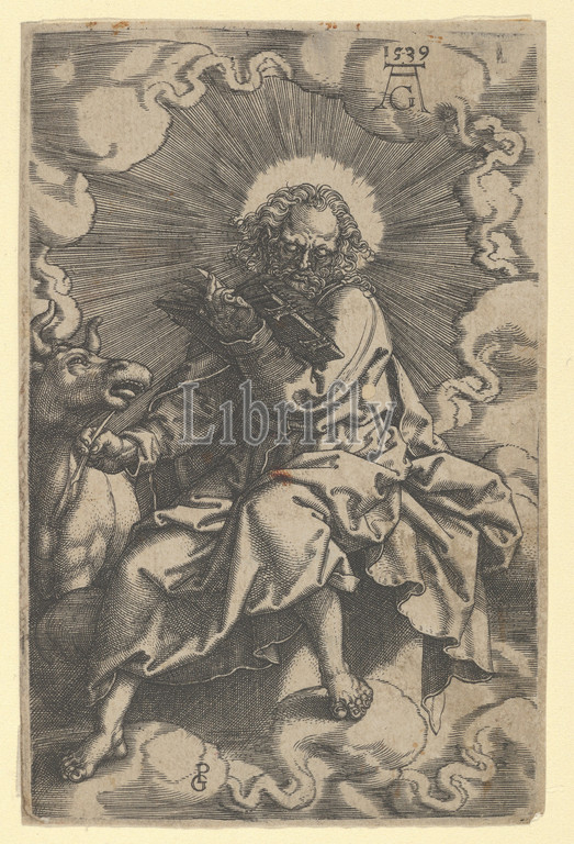 Saint Luke, from The Four Evangelists, 1539, Engraving, Sheet: 4 3/4 × 3 1/8 in. (12 × 7.9 cm), Prints, Heinrich Aldegrever (German, Paderborn ca. 1502–1555/1561 Soest), after Georg Pencz (German, Wroclaw ca. 1500–1550 Leipzig)