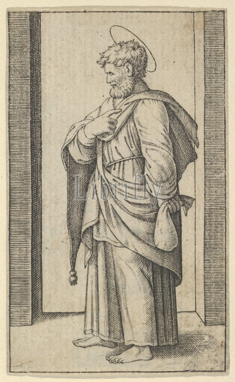 Saint Matthew, a small sack in his left hand, from the series 'Piccoli Santi' (Small Saints), ca. 1500–1527, Engraving, 3 1/8 x 1 7/8 in. (8.0 x 4.8 cm), Prints, Marcantonio Raimondi (Italian, Argini (?) ca. 1480–before 1534 Bologna (?)), Designed by Raphael (Raffaello Sanzio or Santi) (Italian, Urbino 1483–1520 Rome)