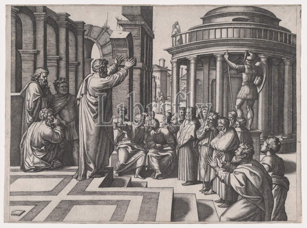 Saint Paul preaching in Athens, after Raphael, ca. 1517–20, Engraving, 10 3/8 x 14 1/16 in. (26.3 x 35.7 cm), Prints, Marcantonio Raimondi (Italian, Argini (?) ca. 1480–before 1534 Bologna (?)), After Raphael (Raffaello Sanzio or Santi) (Italian, Urbino 1483–1520 Rome)