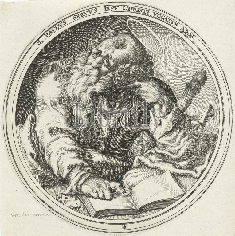 Saint Paul reading, book Christ, apostles, Saint Paul, series title, St. Paul writing, epistles, Zacharias Dolendo, Leiden, c, 1596, paper, engraving