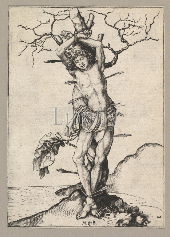 Saint Sebastian, 15th century, Engraving, Sheet, 6 1/4 x 4 7/16, 15.8 11.3 cm, Prints, Martin Schongauer, German, Colmar ca., 1435/50–1491, Breisach