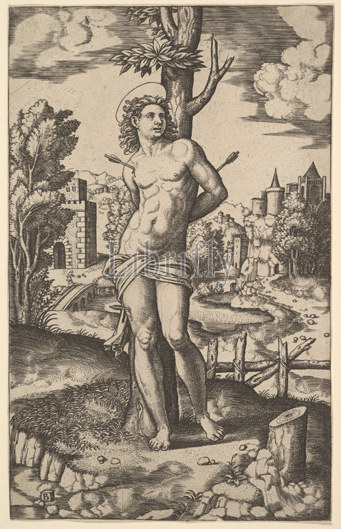 Saint Sebastian tied to a tree and pierced with arrows, 1530–60, Engraving, plate: 8 1/16 x 5 1/8 in. (20.5 x 13 cm), Prints, Master of the Die (Italian, active Rome, ca. 1530–60)