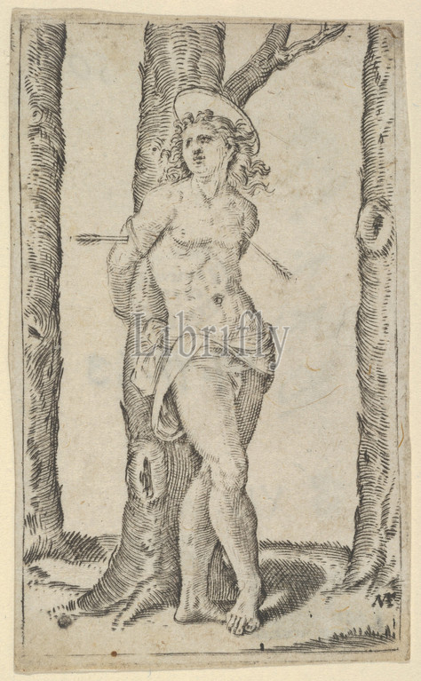 Saint Sebastian tied, tree pierced, arrows, series, Piccoli Santi, Small Saints, ca, 1500–1527, Engraving, 1 15/16 x 3 1/4, 4.9 8.2 cm, Prints, Marcantonio Raimondi, Italian, Argini, ca., 1480–before, 1534, Bologna