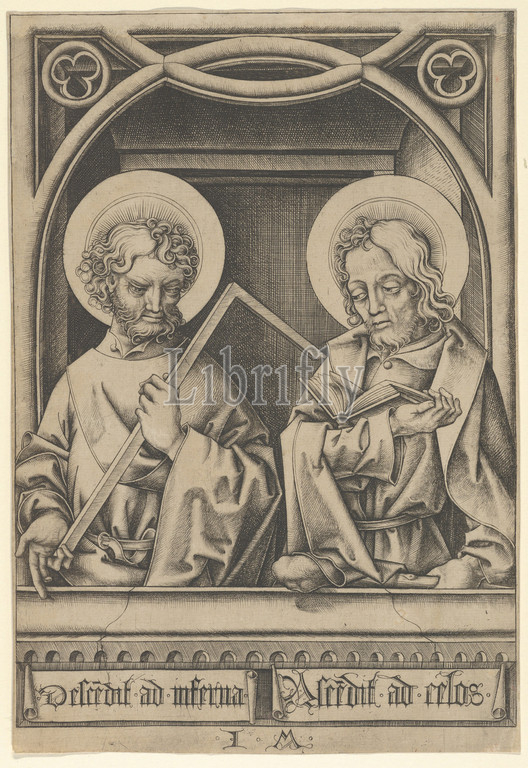 Saints Thomas and James the Lesser, from The Apostles, n.d., Engraving, Sheet: 8 5/16 × 5 11/16 in. (21.1 × 14.5 cm), Prints, Israhel van Meckenem (German, Meckenem ca. 1440/45–1503 Bocholt)