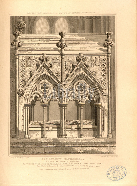 Salisbury Cathedral, Bishop Bridport Monument, Tomb of Giles of Bridport at the Salisbury Cathedral, Wiltshire, signed: Drawn by G. Cattermole; Etch'd by J. Le Keux; Published by Longman & Co, Fig. 48, p. 260, Cattermole, George (drawing); Keux, John Le (etching); Longman & Co. (published), 1821, John Britton: The architectural antiquities of Great Britain: represented and illustrated in a series of views, elevations, plans, sections and details of various ancient English edifices: with historical and descriptive accounts of each. Bd. 5. London: J. Taylor, 1807-1826