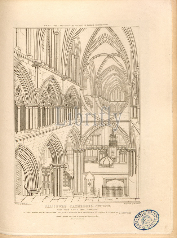 Salisbury Cathedral Church, view from n. to s. small transept, Salisbury Cathedral in Wiltshire, signed: Drawn by F. Mackenzie; Engraved by E. Turrell; Published by Longman & Co, Fig. 47, p. 260, Mackenzie, F. (drawing); Turrell, Edmund (engraving); Longman & Co. (published), 1819, John Britton: The architectural antiquities of Great Britain: represented and illustrated in a series of views, elevations, plans, sections and details of various ancient English edifices: with historical and descriptive accounts of each. Bd. 5. London: J. Taylor, 1807-1826
