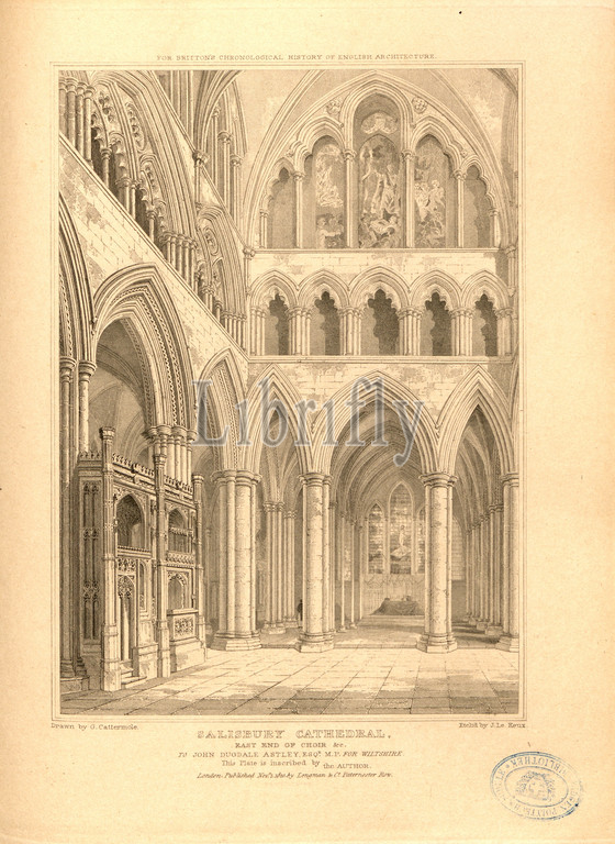 Salisbury Cathedral, east, choir, Salisbury Cathedral, Wiltshire, signed, Drawn, G. Cattermole, Etch'd, J. Le Keux, Published, Longman &, Co, Fig. 46, p. 260, Cattermole, George, drawing, Keux, John Le, etching, Longman & Co., published, 1820, John Britton, architectural antiquities, Great Britain, represented, illustrated, series, views, elevations, plans, sections, details, various ancient English edifices, historical, descriptive accounts, Bd, 5, London, J, Taylor, 1807-1826