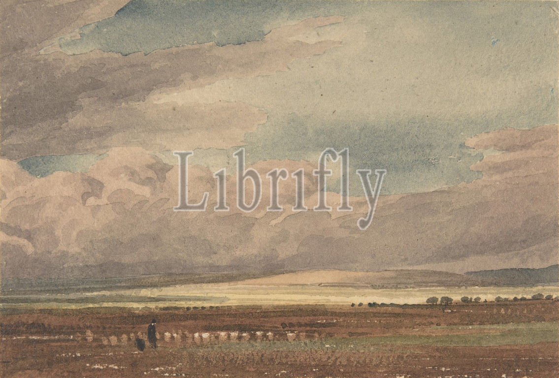 Salisbury Plain, Old Sarum, Distance, Wiltshire, 1800–1862, Watercolor, graphite, gum arabic, scratching out, sheet, 4 3/4 x 6 15/16, 12 17.7 cm, Drawings, William Turner of Oxford, British, Black Bourton, Oxfordshire, 1789–1862, Oxford, Washes, mauve, blue, dragged, wet across, rough-textured paper, caused, buckle slightly, create, darkening sky, Beneath, clouds, fill, largest portion, single figure accompanied, dog-conveyed, brisk black, strokes-walks, field, narrow horizon, brilliant, white-yellow light