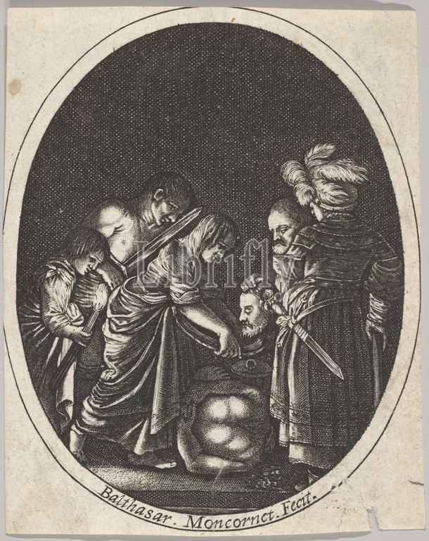 Salome receiving, head, John, Baptist, surrounded, three men, child bearing, torch, body lies, ground, oval composition, ca, 1630–68, Engraving, Sheet, 2 5/8 x 2 1/16, 6.7 5.3 cm, Prints, Balthazar Moncornet, French, Rouen, 1600–1668, Paris, After Hendrick Goudt, Dutch, The Hague, 1583–1648, Utrecht, Adam Elsheimer, German, Frankfurt, 1578–1610, Rome