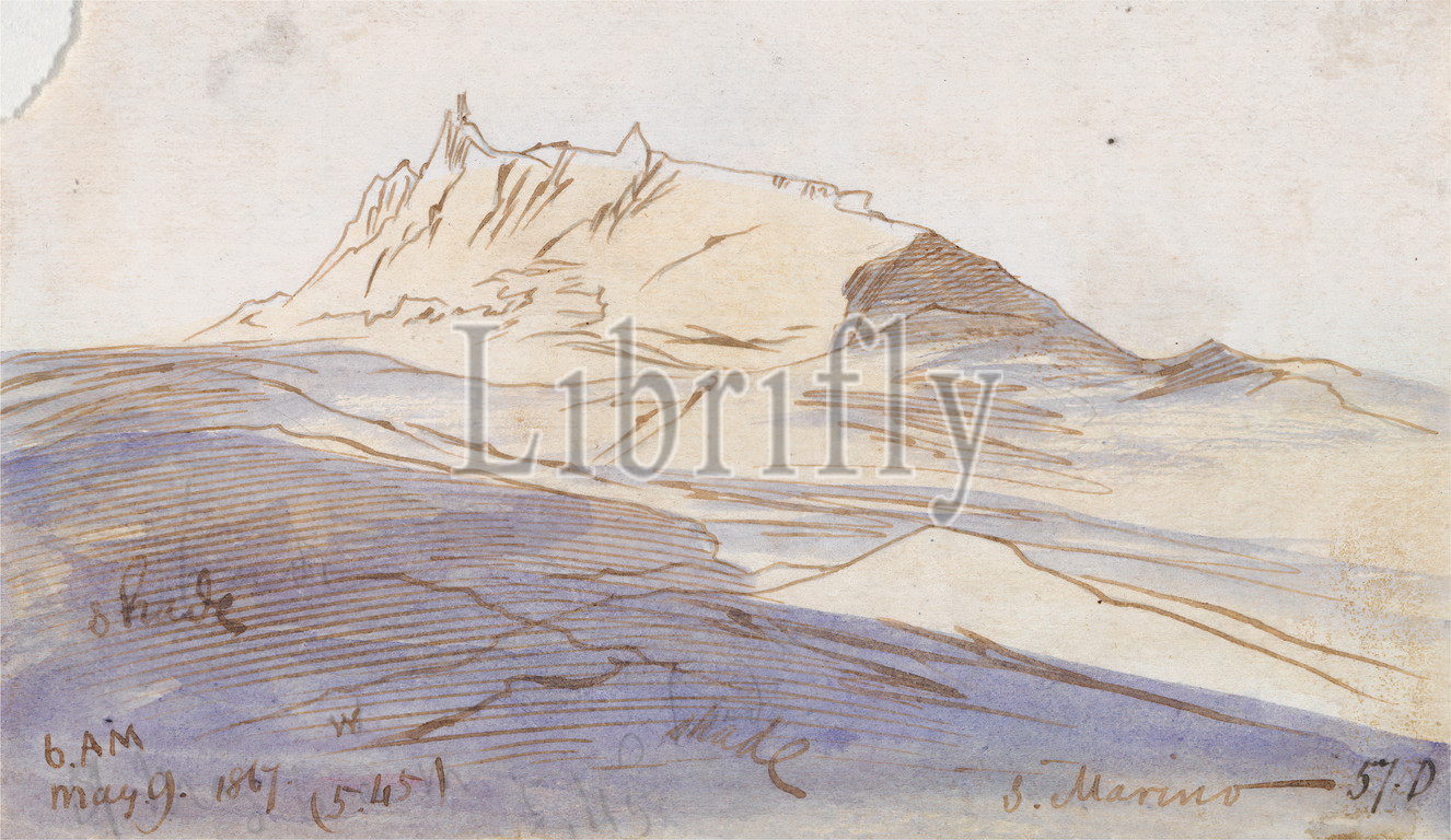 San Marino, Edward Lear, 1812–1888, British, 1867, Watercolor, graphite, pen, brown ink, medium, slightly textured, cream wove paper, Sheet, hill, landscape, Italy, San Marino