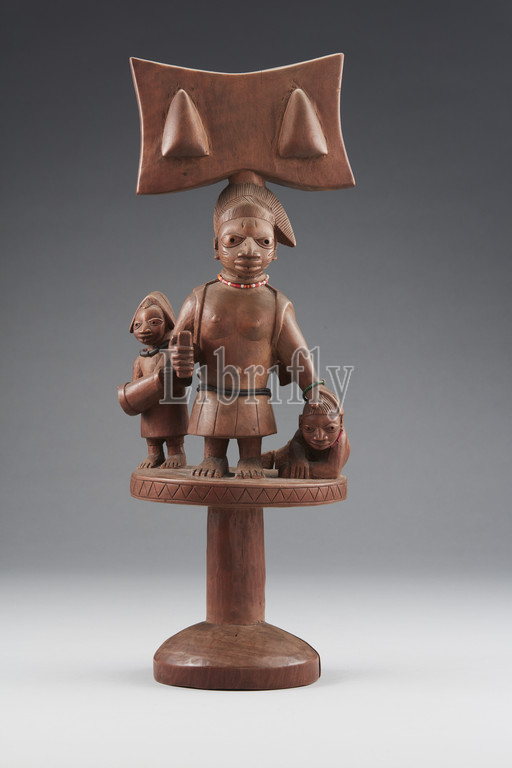 Sango staff (Ose Sango), Duga of Meko (Nigerian, 1880-1960), 20th century, wood, glass, fiber, 18-7/8 x 7 x 6-1/8 in., Inscription: collector's number in white paint at center of undersidel: E79.9, African Art
