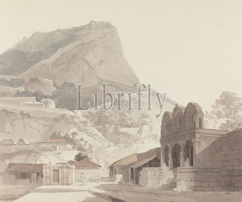 Sankrydroog, Madras, William Daniell, 1769–1837, British, 1792, Watercolor, graphite, medium, smooth, cream laid paper, landscape, mountains, temples, trees, Madras