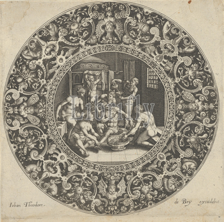 Sardanapal, Bath, 1576–1623, Engraving, Sheet, 2 1/2, 9/16, 6.4, 6.5 cm, Johann Theodor de Bry, Netherlandish, Strasbourg, 1561–1623, Bad Schwalbach, after Crispijn Passe the Elder, Arnemuiden, 1564–1637, Utrecht, Maerten Vos, Antwerp, 1532–1603, scene, bearded figure, Assyrian king, bath, center, surrounded, six attending, slaves, framed, circular ornamental, frieze, pairs, animals, groupings, fruit